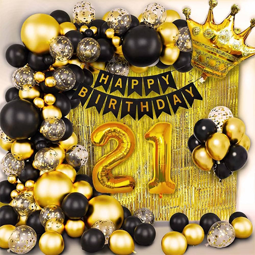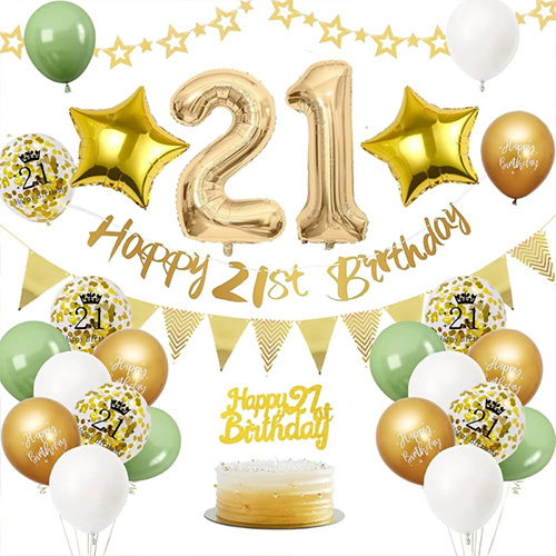 Súprava 21. balónika: Táto súprava 21. balóna sa skladá z latexových balónov, fóliových balónov, narodeninových vlajok a ďalších doplnkov. Ľahko sa montuje a môže urobiť oslavu 21. narodenín slávnostnejšou. Takéto kvalitné a ohromujúce prostredie vám pomôže rozjasniť noc vašich 21. narodenín a urobí z toho vzácny okamih, na ktorý vaša dcéra, vy ani celá rodina nikdy nezabudnú.