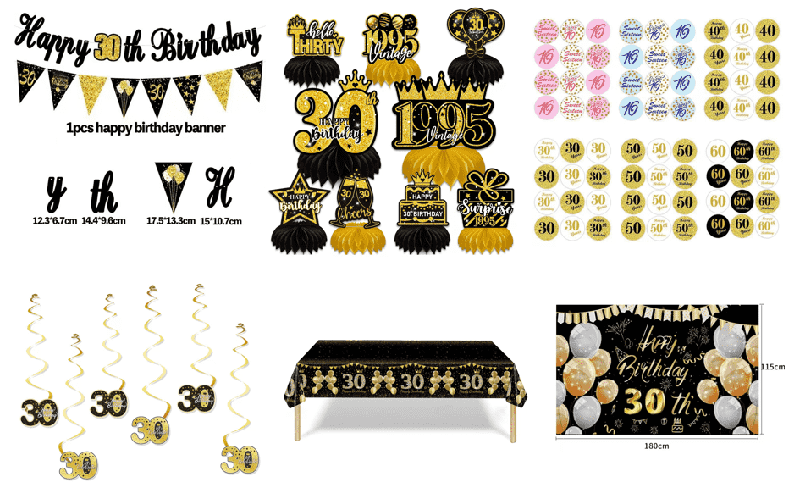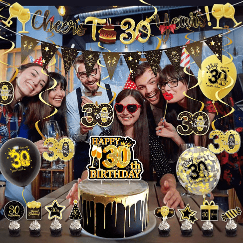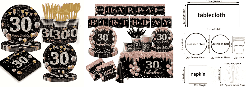 Papierová narodeninová pohľadnica je jadrom dekorácie torty: hlavná pohľadnica je založená na slovách ako "Happy 30th BIRTHDAY" a je zladená s tvarom pohára na šampanské. Veľkosť je veľká a vhodná na ozdobenie hlavnej torty. Nechýbajú ani kruhové logo "30", hviezdičky, korunky a iné malé kartičky, vhodné na košíčky, vyrobené zo zhrubnutého tvrdého kartónu, naspodu s bambusovými tyčinkami, ktoré sa dajú vložiť na použitie.