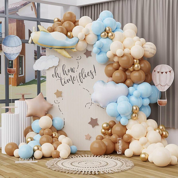 Balónová girlanda s fóliovým balónom do lietadla:Táto balónová girlanda s fóliovým balónikom sa skladá zlatexové balóny, fóliové balóny, balónové lepiace body, rybárske vlasce a ďalšie príslušenstvo k balónom. Pomocou tohto príslušenstva môžete jednoducho vytvoriť balónový oblúk. Naše latexové balóny a fóliové balóny sú vyrobené z prírodného kaučuku a vysoko kvalitných hliníkových fóliových materiálov, ktoré sú bezpečné a netoxické a dokážu vytvoriť krásny balónový girlandový oblúk. Táto girlanda z balónového lietadla je vhodná na rôzne tematické scény, vrátane narodeninových osláv, večierkov s tematikou lietadla, večierkov s tematikou času a krstu detí. Je ideálny na dodanie farebného nádychu každej oslave.