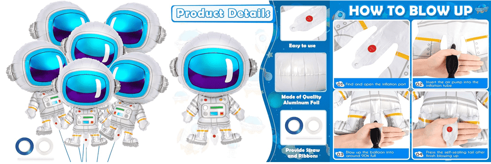 Existujú bežné astronauti v tvare celého tela, zobrazujúci obraz astronautov v skafandri, niektoré štýly so základňou, nafukovacie môžu stáť. Existujú rôzne veľkosti, ako napríklad 18 palcov, 24 palcov, 28 palcov atď., Ako aj niektoré väčšie balóny, ako napríklad fóliové balóny pre stojacich astronautov s výškou 65 cm. Používa sa najmä na narodeninové oslavy s vesmírnou tematikou, oslavy na uvítanie bábätiek, výzdobu detskej izby a iné príležitosti, ktoré môžu podujatiu dodať radostnú vesmírnu atmosféru.