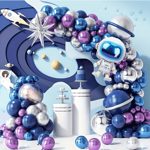 Sada girlandy s fóliovým balónikom pre astronauta je pútavá zbraň pre veľké aktivity, vhodná na stenu pozadia na párty, vstup do nákupného centra. S balónovou reťazou ako základňou sú balónik s tlačou astronautov, fóliový balónik s raketou, farebný balónik s planétou a matný latexový balónik vzájomne prepojené a upevnené. Veniec je možné zavesiť priamo na stenu alebo rám dverí. Systém farieb hlbokej hviezdnej oblohy je zladený s jasným kovovým leskom, ktorý okamžite naplní pohlcujúcu atmosféru priestoru a stane sa vizuálnym ohniskom miesta aktivity.