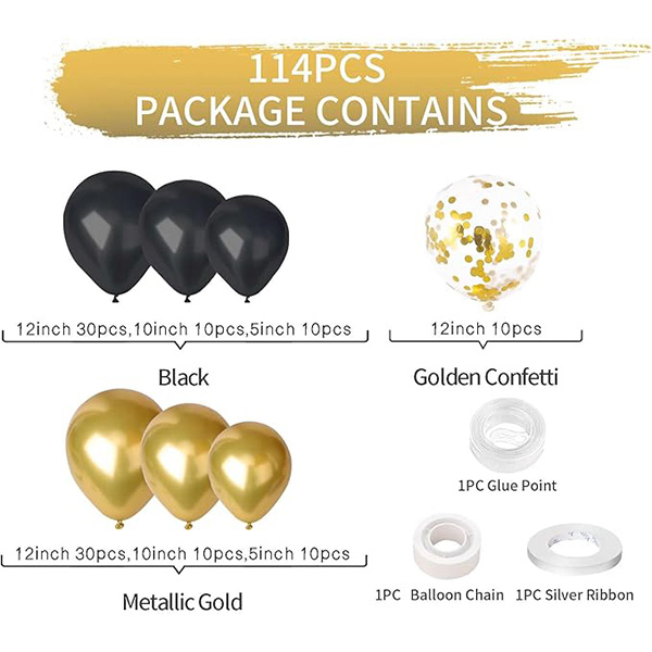 ŠIROKÉ POUŽITIE: Hromadné čierno-zlaté súpravy Balloon Arch sú vhodné na mnohé príležitosti. Môžete nimi ozdobiť narodeniny, Silvester, rôzne festivaly, Deň detí a podobne.