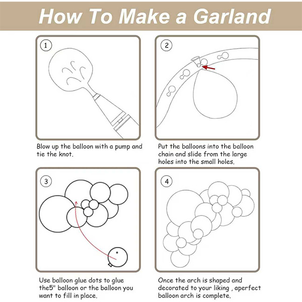 Pozor a varovanie:Prosím, NEPREPLŇUJTE balóniky a tiež sa vyhýbajte spáleniu slnkom, prehriatiu, špicatým predmetom a nadmernému treniu. Ovládajte množstvo vzduchu nafúknutého do každého balóna, aby ste dosiahli ideálnu veľkosť balóna, užite si párty so súpravami Balloon Garland Arch.