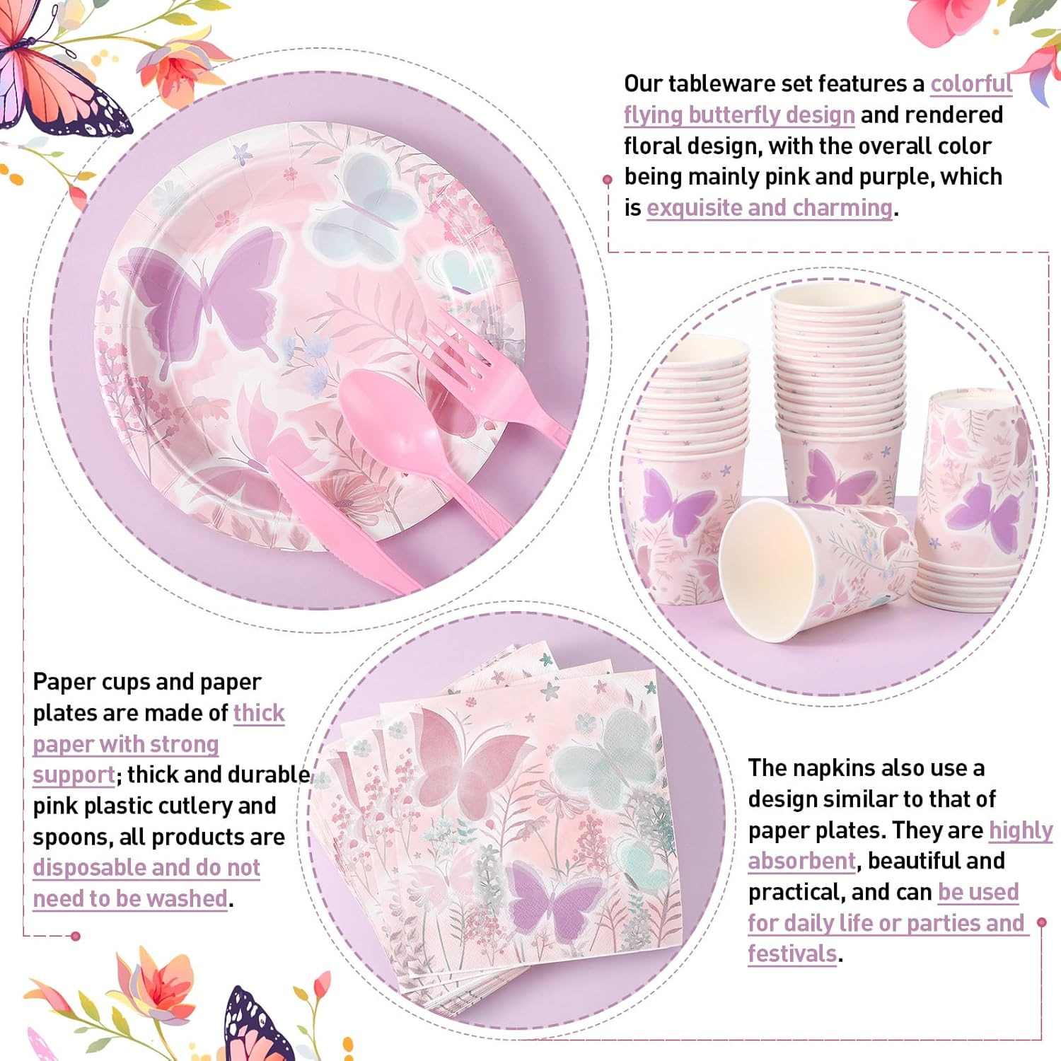 Skvelou možnosťou pre párty je súprava motýľového párty riadu. Zahrnuté sú obrúsky, papierové taniere, papierové poháre, vidličky a nože. Každý kus zobrazuje časti motýľov.