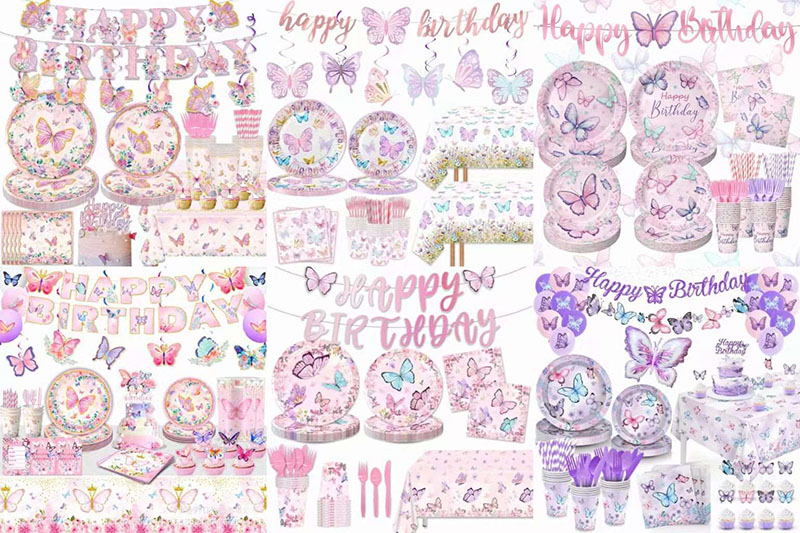 V dizajne sú ako hlavná časť použité farebné motýle. Je zmiešaný s kvetmi a lesklým prachom. Farby sú jasné a majú veľa štýlov. Existujú zelené tóny, ružové a fialové tóny a tóny ružového zlata. Tvary písmen vyzerajú zvláštne. Môžu ladiť s motýľovými vešiakmi alebo špirálovými motýľmi. Celý vzhľad pôsobí plným a bohatým dojmom. Ružový a fialový motýľový listový banner s 3D motýľmi a mäkkými stuhami môže visieť na stene alebo strope. Rýchlo rozžiari priestor na párty a slová „Všetko najlepšie k narodeninám“ vyzerajú, akoby sa otvárali medzi motýlími krídlami.