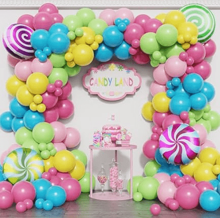 Súprava balónovej girlandy s motívom cukríkov s cukríkovou farbou a roztomilým tvarom lízanky ako základnými dizajnovými prvkami, celkový štýl je živý a sladký.