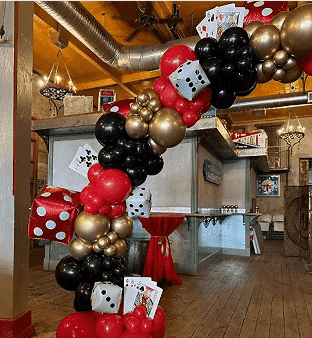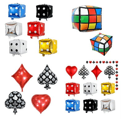 Balónová girlanda pre kasíno obsahuje hlavne latexové balóny, prichádzajú v rôznych veľkostiach (5 palcov, 10 palcov, 12 palcov a 18 palcov). V ich farbách zvyčajne dominuje červená, čierna, zlatá atď. Na zvýšenie efektu vrstvenia súpravy môžete vidieť aj priehľadné latexové balóny a konfetové latexové balóny. Ako motív súpravy sú nepostrádateľné aj fóliové balóny s motívom kasína.
