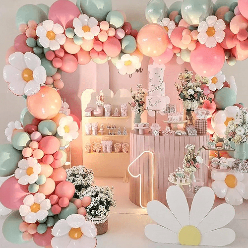 Narodeninová oslava: Balónová girlanda Daisy môže byť použitá ako dekorácia pozadia na narodeninovú oslavu, vhodná na aranžovanie na detských alebo dámskych narodeninových oslavách, vytvára radostnú atmosféru.