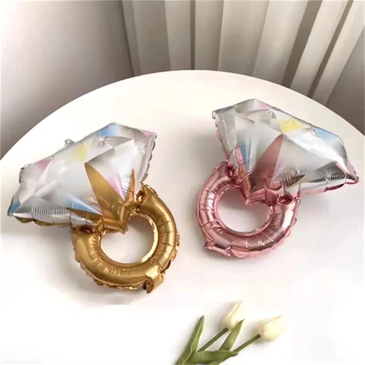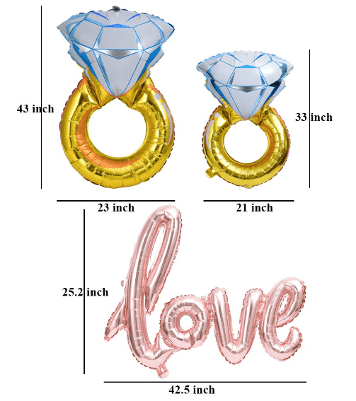 Ako ikonická ozdoba romantickej tematickej párty obsahuje fóliový balónik zásnubný prsteň rôzne farby a štýly s nádhernými vzormi a pokročilým zladením farieb. Výrobok je vyrobený z vysoko odolného kompozitného polyesterového fóliového materiálu z hliníkovej fólie, pevného spracovania, silného tesnenia a môže sa nabíjať za predpokladu správneho skladovania. Je to kvalitný predajný bod pre koncových spotrebiteľov.