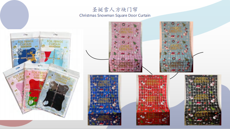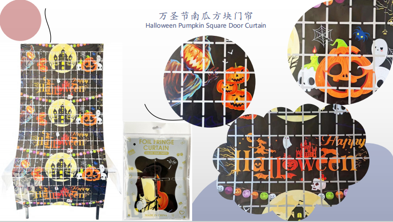 Ako je vianočná zelená a červená fóliová opona, čierna a pomarančová fóliová opona s halloweenom a záves fólií s tekvicami, netopiermi, pavúkami a inými tvarmi, ktoré sa dajú použiť na prázdninové dekorácie v domoch, nákupných centrách, baroch a iných miestach.