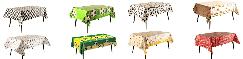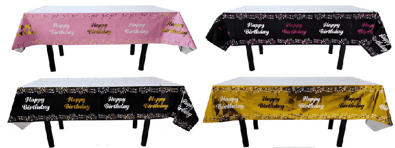 dúhová farba, fóliové prestieranie s kreslenými zvieratkami a vzormi tort, vhodné na detské narodeninové oslavy; zlatá, strieborná, laserová farba s hviezdami a vzormi písmen, vhodná na narodeninové oslavy pre dospelých, oslavy výročia, priateľské párty a pod., možno usporiadať do rodinných jedálenských stolov, hotelových párty stolov, vonkajších piknikových stolov a iných scén.