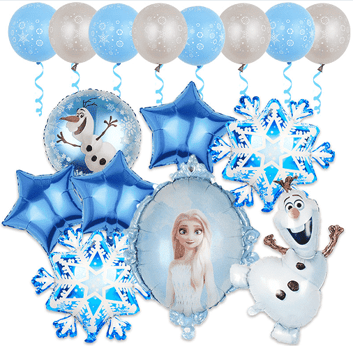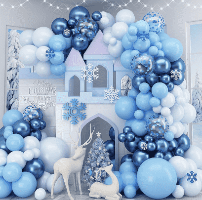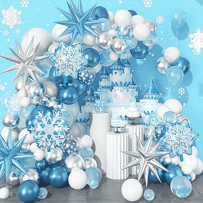 3.Súpravy mrazených balónových girlandzvyčajne obsahujú rôzne veľkostimrazené balóny, unikátne fóliové balóny, zodpovedajúce ozdobné stuhy, nafukovačky, neoznačené lepiace miesta, inštalačné pásiky a ďalšie príslušenstvo na splnenie požiadaviek na rozloženie na jednom mieste. Všetky komponenty sú vyrobené z bezpečných a ekologických materiálov, plne prispôsobených scénam aktivít detí. Balónový vzor v obleku je starostlivo zladený a kombinuje klasický obraz postavy Frozen so snovými prvkami ľadu a snehu. Farby sú modrá, biela a strieborná, čo vytvára čistú a romantickú magickú atmosféru.