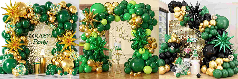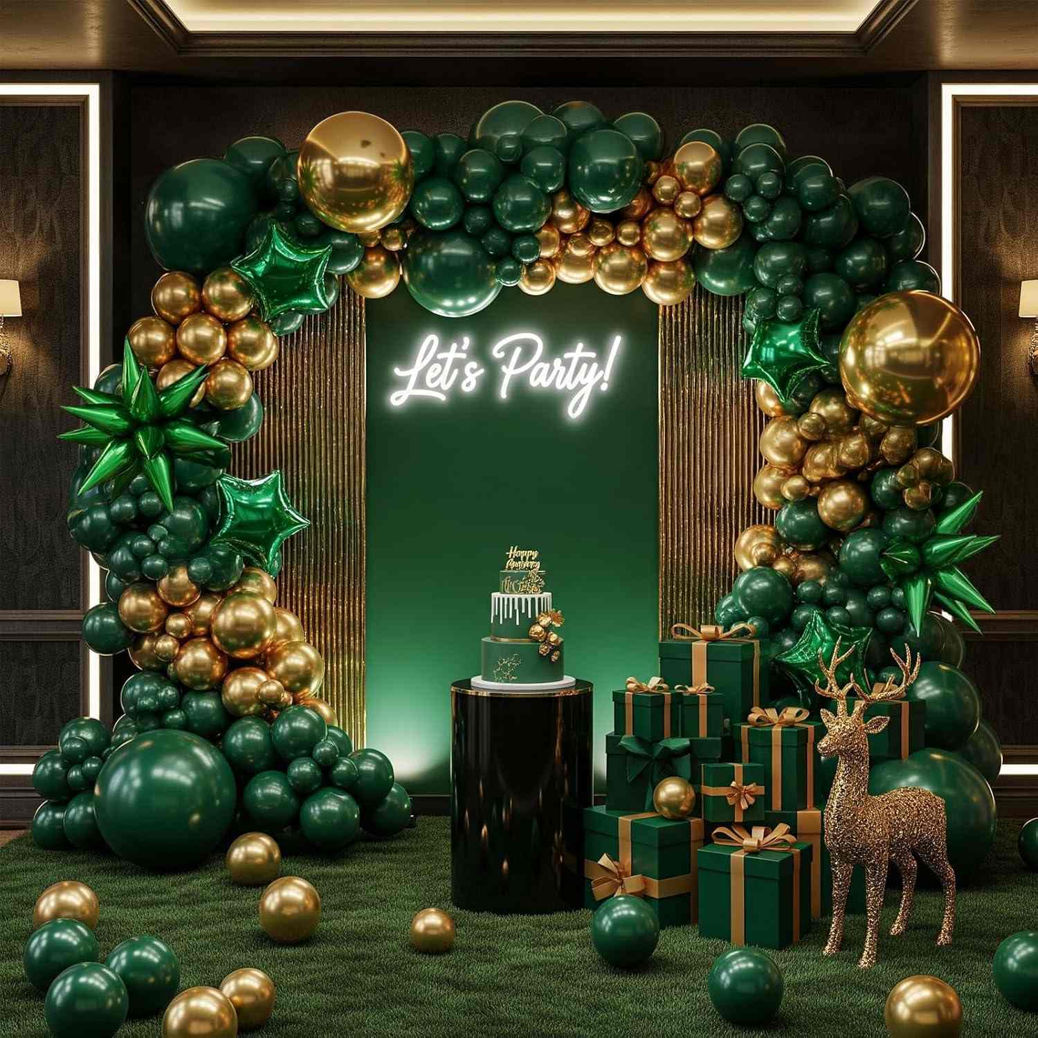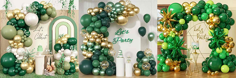 Zeleno-zlatý balónový oblúk využíva ako hlavnú myšlienku prírodné a luxusné tóny. Kombinácia zelenej a zlatej vytvára svieži a elegantný párty vzhľad. Oblúk má veľa zelených odtieňov, ako je matná tmavo zelená, retro fazuľová zelená, retro avokádová zelená, retro tmavo zelená a tak ďalej. Každá farba zobrazuje svoju vlastnú vrstvu a textúru. Thezlaté balónydobre zladiť so zelenými. Tie zelené prinášajú pokoj a prirodzený pocit. Tie zlaté dodávajú lesk a punc luxusu. Tieto dve farby sa navzájom dopĺňajú. Vytvárajú atmosféru, ktorá je sofistikovaná a elegantná.