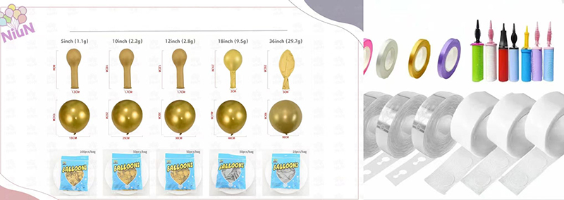 Oblúková súprava má 5-palcové, 10-palcové, 12-palcové, 18-palcové alebo 36-palcové balóny. Kombinácia týchto rôznych veľkostí vám umožní ľahko vytvoriť balónový oblúk s plným a vrstveným vzhľadom.