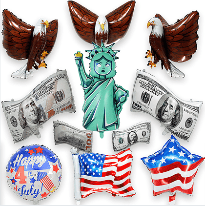 Dajú sa opakovane nafukovať s prihliadnutím na praktickosť a ochranu životného prostredia. V procese dekorácie sme pridali rôzne špeciálne prvky sviatočnej dekorácie. Latexové balóny sú potlačené nádhernými hviezdicovými pruhmi, vzormi päťcípej hviezdy a anglickými slovami "Happy 4th of July". Fóliové balóny sa používajú na vytvorenie klasických tvarov dňa nezávislosti, ako sú trojrozmerné hviezdne pruhy, orol bielohlavý a číslo „4“. Niektoré balóny sú tiež pridané s bleskovými prvkami, ako je zlatý prášok a flitre, aby bol efekt dekorácie pútavejší.