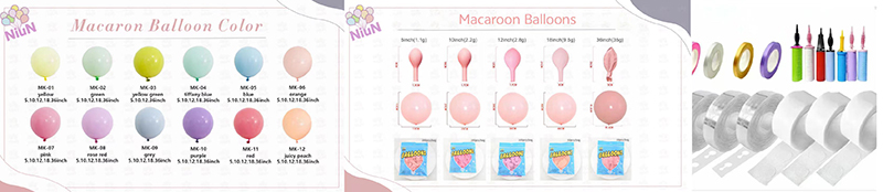 Sada je tiež dodávaná s balónovými reťazami Niun®, lepidlami, stuhami a ďalšími nástrojmi. Tieto nástroje môžete použiť na voľne kombinovanie balónov. Môžete si vyrobiť girlandu alebo stenu pozadia. Môžete ich tiež zmiešať s fóliovými balónikmi a magickými balónikmi. Výsledkom je dekorácia s väčšou hĺbkou a 3D efektom.
