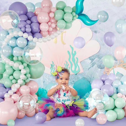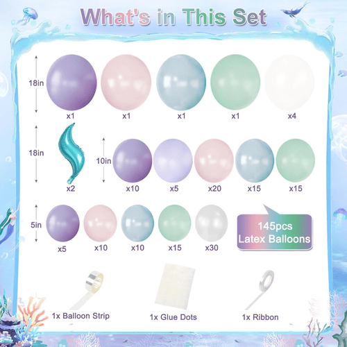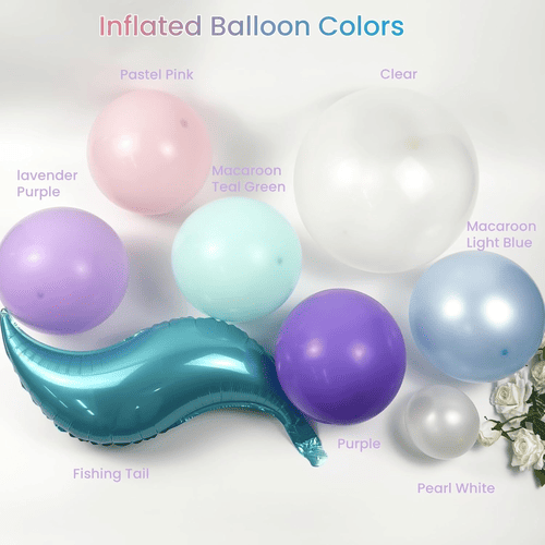 Balóny v balónovej girlande morskej panny sa dodávajú v rôznych farbách, ako je fialová, levanduľová, pastelová ružová, svetlo modrá, modrozelená, perleťovo biela a priehľadná, spolu s fóliovými ozdobami na chvost morskej panny, vďaka čomu sú skvelé na vytvorenie čarovnej párty s morskou pannou.
