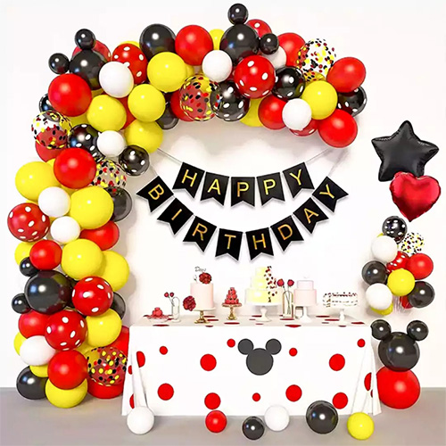 Narodeninový papierový banner je pestrofarebný a krásne vzorovaný a fóliový záves je ľahký a elegantný, dodáva romantickú atmosféru celému oblúku. Navyše dizajn tohto balónového oblúka Mickey Mouse je jedinečný a vhodný na chlapčenské a dievčenské narodeninové oslavy, ktoré dokážu okamžite umocniť živú atmosféru scény.