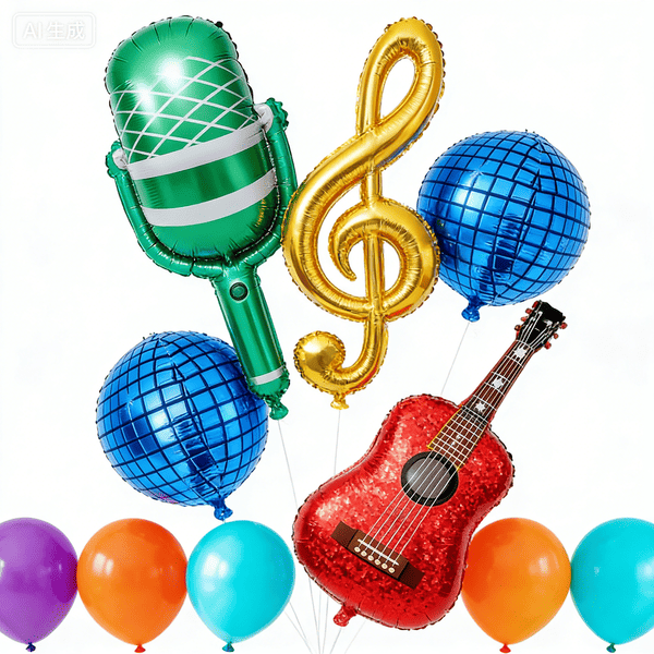 Hudobné fóliové balónyprichádzajú s rôznymi druhmi, ako sú fóliové balóniky na hudobné nástroje (fóliové balóniky na gitaru, fóliové balóniky na mikrofón) a fóliové balóniky na noty. Keďže sa populárna hudba stáva čoraz populárnejšou, teraz vlastnia veľký trh. Napríklad film: Kpop Demon Hunters je teraz vírusom v Spojených štátoch. Mnoho amerických tínedžerov dúfa, že do svojich narodeninových osláv začlenia relevantné hudobné prvky, aby vzdali hold tomuto filmu. Aby sme vyhoveli všetkým potrebám zákazníkov, pripravili sme pre nich rôzne farby: pre chlapcov môžete použiť tmavomodrú, modrú, čiernu a hnedú; pre dievčatá môžete použiť ružovú, svetloružovú, fialovú a tak ďalej. Vždy na vás čaká vhodná farba. Majú veľkú flexibilitu a môžete ich ľubovoľne kombinovať. Ako napríklad pridanie niekoľkých latexových balónov na vytvorenie súpravy girland z hudobných fóliových balónov. Alebo použite niekoľko balónov na vytvorenie malej súpravy hudobných fóliových balónov.