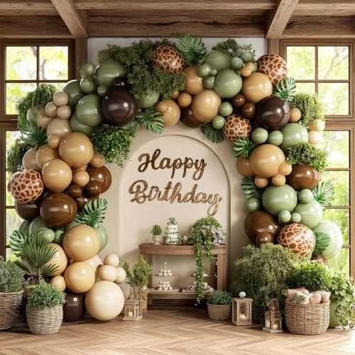 Safari Balloon Arch obsahuje základné prvky lesnej témy. Hnedé balóny predstavujú kmene stromov, zelené balóny symbolizujú listy a rôzne vytlačené balóny zobrazujú rôzne zvieratá, čím vytvárajú pocit, že organizujete párty priamo v lese. Bez námahy vytvára štýlovú a atmosférickú párty scénu.