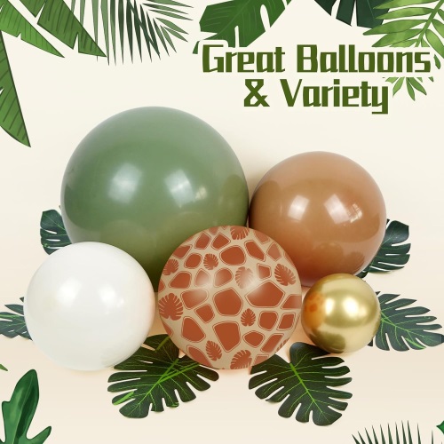 Na jeden oblúk balóna Safari pripadá viac ako 100 kusov latexových balónov. Obsahuje 5-palcové, 10-palcové a 18-palcové tmavozelené latexové balóniky, 5-palcové, 10-palcové a 18-palcové avokádovo zelené latexové balóniky, 5-palcové, 10-palcové a 18-palcové hnedé latexové balóniky, 10-palcové pieskovo biele latexové balóny, 10-palcové čajové zelené balóniky 10-palcové zlaté latexové balóny, 12-palcové latexové balóny na konfety, 12-palcové balóny s potlačou žirafy, 12-palcové balóny s potlačou tigra a príslušenstvo k balónom.