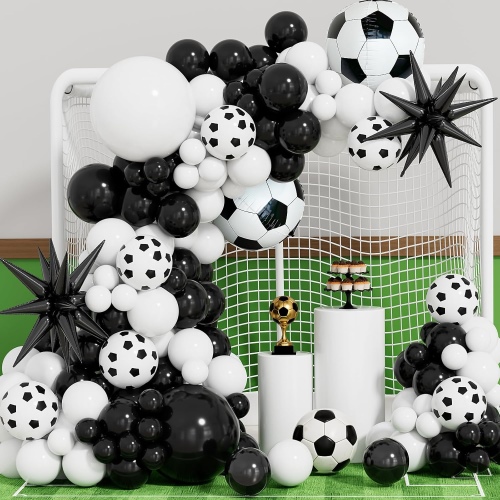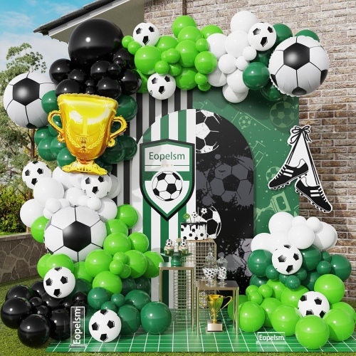 Naše súpravy girland na futbalový balón majú viacero dizajnov, vrátane čiernej a bielej kolekcie. Predstavujú klasické futbalové farby, ešte zvýraznené futbalovými fóliovými balónmi, ktoré sú starostlivo navrhnuté tak, aby tvarom a detailmi pripomínali skutočný futbal. Umocňujú tému. Ponúkame aj kombinácie zelenej, bielej a čiernej série. Zelená symbolizuje svieži trávnik, kde sa po smaragdovo-zelenom ihrisku radostne valia futbalové lopty. Vytvárajú živú, pohlcujúcu a autentickú atmosféru štadióna.