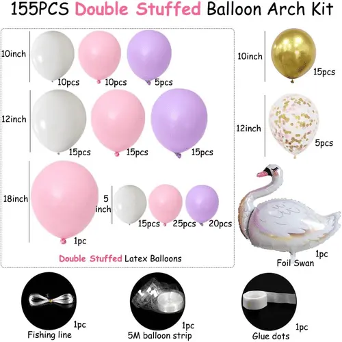 K balónovému oblúku Swan pridáme rôzne doplnky. Vrátane bodkového lepidla, balónového prúžku a stuhy. Okrem toho môžeme pridať aj ďalšie príslušenstvo podľa vášho želania.