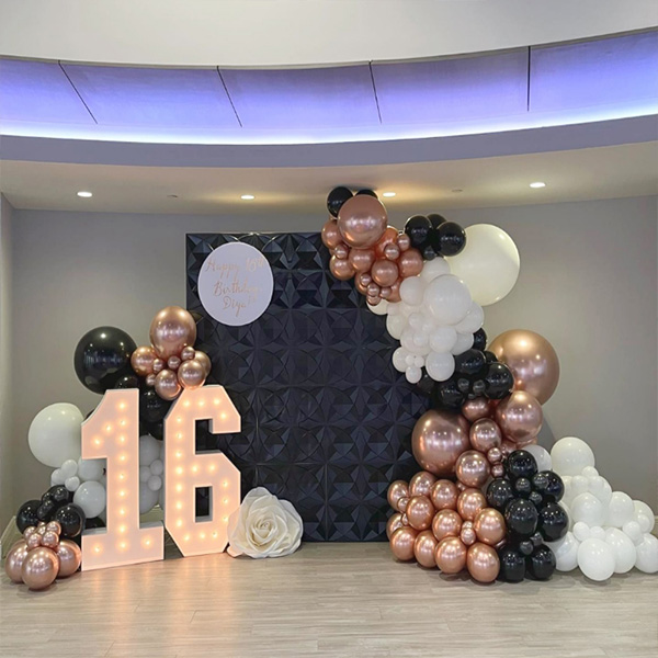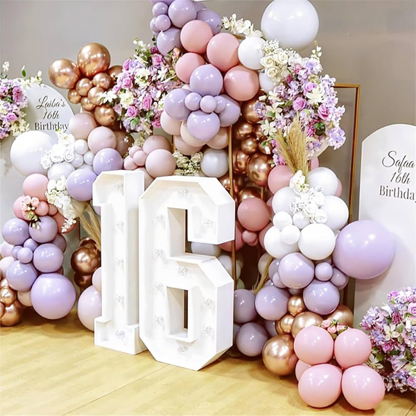 Balónová girlanda so 16 LED svetlom:Naša továreň tiež uviedla na trh balónovú girlandu so 16-ročným led svetlom. LED číselné svetlá sú vyrobené z ekologických materiálov ABS a LED, ktoré poskytujú jasné a trvalé svetelné efekty. LED svetlá s číslami a písmenami, ktoré môžu svietiť v tme. Jemné osvetlenie vytvára uvoľnenú a pohodlnú atmosféru a dodáva jedinečné čaro každej miestnosti. Môžu byť vystavené samostatne alebo zavesené na stene, na krbovej rímse alebo umiestnené v priestore recepcie na použitie počas akcií alebo osláv. LED číselné svetlá s balónovými girlandovými oblúkmi, vhodné na vytvorenie pohlcujúcej atmosféry večierkov, sú nevyhnutnou rekvizitou na snímanie jedinečných a nezabudnuteľných fotografií, ktoré vašim 16. narodeninám dodajú nezabudnuteľný slávnostný nádych.