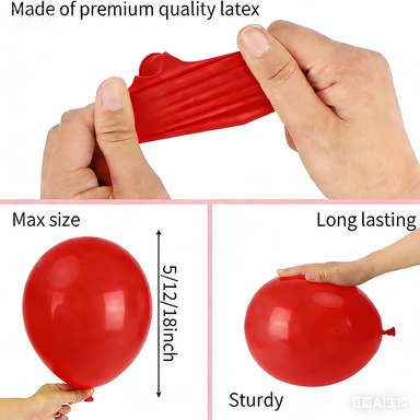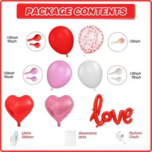 Táto súprava balónov pozostáva hlavne zlatexové balónya niekoľkofóliový balón. Latexové balóny z nich sú červenej, ružovej, bielej farby. Sú vyrobené zo 100% prírodného latexu, ktorý je úplne ekologický a neškodný pre ľudské telo. A ich veľkosť je tiež rôzna. Na vytvorenie krásnej vrstvy sú veľkosti latexových balónov od 5 palcov do 12 palcov. Usporiadať ich do sady je veľmi jednoduché, pripravíme k nej aj bodkové lepidlo a balónikovú retiazku. Takže pri jeho zariaďovaní to zvládnete flexibilne.